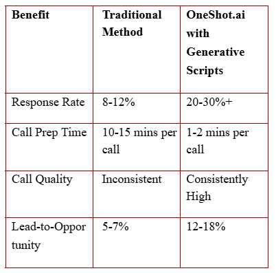 In contrast to general AI solutions, OneShot creates rich persona models that are aware of industry, job function, and buying cycle—so every script reads human, not robotic.